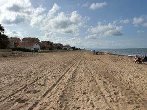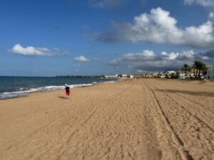 Po obědě, když chlapečci usnuli jsme vyrazili s Marou nakoupit. Přímo u ubytování je jen malý, předražený obchůdek, kde toho moc nemají, a tak jsme šli do velkého supermarketu asi tři kilometry odtud. Jelikož nemáme auto, naznala jsem, že nejlepší způsob, jak se tam dostat, je stopovat. První cestu jsme zvládli asi po sedmi minutách stopování, kdy nás nabral místní páreček našeho věku. Druhá cesta se čtyřmi taškami jídla a rodinným balením toaletního papíru byla trošku náročnější. Mara si dával ve stínu svačinku a spokojeně seděl na patníku (poznámka redakce: píše patník, myslí obrubník), zatímco já jsem se široce usmívala a vehementně stopovala. Nemohla jsem věřit tomu, kolik projelo řidičů s prázdným autem a nikdo nás nevzal. Mara se mi trochu vysmál za mé naivní očekávání, že nás vezme první prázdné auto, co projede. Asi za 15 minut nám zastavila milá dáma v ještě milejším BMW. Vybalila jsem na ni moji větu: Nosotros necesitos dos kilometros directos. Je to (nesprávně řečeno) potřebujeme jet dva kilometry rovně, ale paní mi rozuměla a hodila nás až ke dveřím. Byla z Kazachstánu, před dvaceti lety sem dojela za kamarády, a už tu zůstala. To mi za ty tři minuty cesty, co jsme spolu strávili v autě, přišlo jako zajímavá informace.