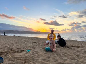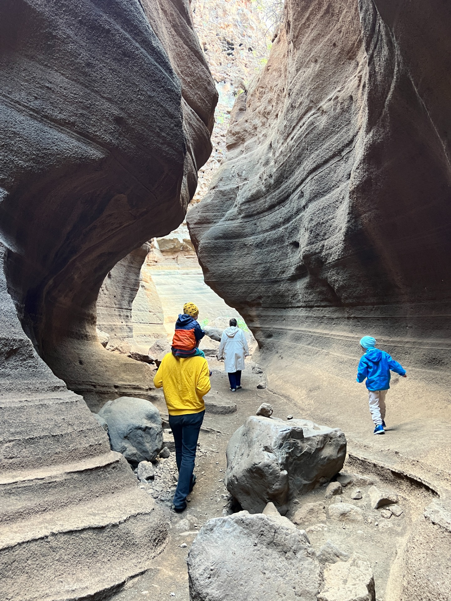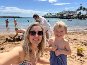 Radši jsme to otočili a vyrazili zpět do auta, kde jsme po pár minutách rozmrzli a vyjeli na jih do města Mogán. Kupodivu bylo na jihu opravdu o dost tepleji než v Las Palmas a konečně jsme si užili pláž a slunce. Kluci celou dobu blbli v písku a hráli si.