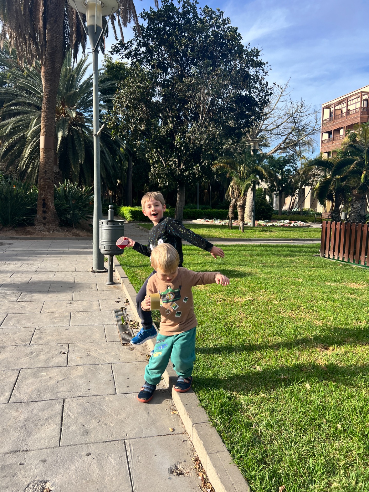 Dnes jsme byli v papouščím parku asi čtvrt hodiny cesty autobusem od našeho apartmánu. Chlapečci si s sebou vzali velké lepící pásky a jako chudé děti z východní Evropy si s nimi v parku kutáleli. Zabavilo je to na opravdu dlouhou dobu, takže mi bylo dosti jedno, jak to vypadá před ostatními rodiči. Stejně jako Čendovy roztrhané tepláky. To dítě umí prodřít kolena po dvou nošeních a za týden tady dokázal vyrobit díry na kolenou u dalších dvou tepláků. Tak holt vypadá jak ze sirotčince. Mu to nevadí, mně taky ne, jen babi je ze staré školy a těžce to nese.
