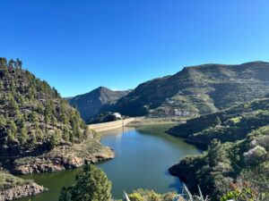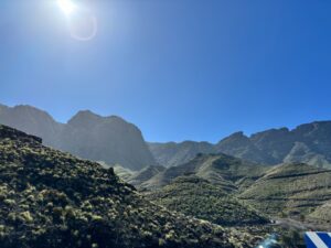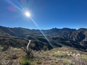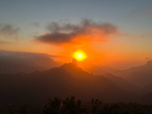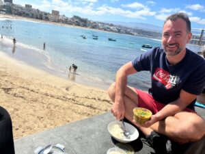 Následovala cesta na úplný jih ostrova do Puerto de Mogán na moji oblíbenou paellu. V Mogánu jsme se chvíli pováleli na pláži, dali si zmrzlinu a putovali dál na pár pitoreskních vyhlídek. K večeru jsme dorazili do malebného horského městečka Tejeda, nakoupili si zákusky a vyjeli na blízký kopec, kde Marek objevil úžasné místo s nepopsatelných výhledem. Byli jsme v docela velké nadmořské výšce, takže okolo nás rostla normální tráva, kvetly květiny a celé okolí vypadalo jak pozadí z Teletubbies. Následoval neskutečný západ slunce. Byla to taková romantika, až z toho přecházel zrak. Abych tu romantiku pořádně podpořila, vytáhla jsem chleba se sekanou, hořčicí a kyselýma okurkama a nakázala Marovi, že to musíme sníst, jinak se to zkazí. Přece to nevyhodím, když se s tím máma vaří, já to chystám a celý den tahám s sebou, ne? Po sekačce jsme si dali zákusky a užívali si okolní idylku. Jen, co zapadlo slunce, snížila se teplota vzduchu tak o 15 stupňů, takže jsme se honem dodrkotali do Tejedy na apartmán, pustili všechny přímotopy a rozmrzali v posteli u seriálu. No, den jako malovaný.